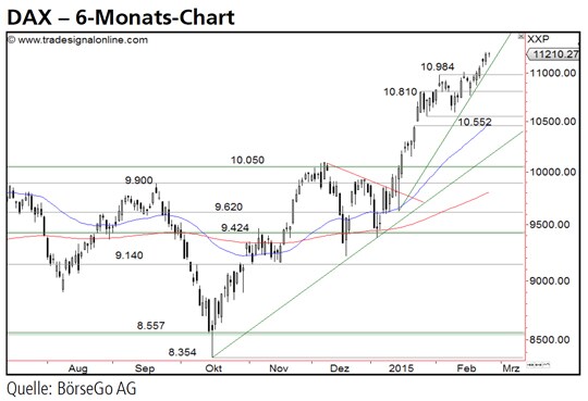 Rückblick: Seit dem Ausbruch aus einer Dreiecksformation knapp unterhalb des vorherigen Rekordhochs bei 10.093 Punkten trieben die Bullen den DAX Index innerhalb kürzester Zeit in Richtung der 11.000 Punkte-Marke an.