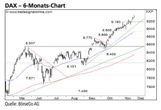 Rückblick: Nach dem Ausbruch aus einer bullishen Flagge Mitte Oktober setzte sich der massive Aufwärtstrend des DAX Index in den letzten Wochen mit unverminderter Aufwärtsdynamik fort. In einer...