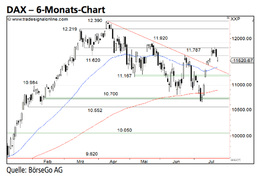 Ausblick: Der Kaufimpuls seit Anfang Juli ist zunächst un - terbrochen und ein bullisher Rücklauf an die überwundene Abwärtstrendlinie nach unserer Einschätzung zu erwarten. Im Anschluss sollte sich die jüngste Rally jedoch fortsetzen. Die Long-Szenarien: Die Gegenbewegung seit dem Erreichen der 11.787 Punkte-Marke könnte den DAX jetzt bis 11.400 Punkte drücken, ehe der Index an dieser Stelle wieder zu alter Stärke zurückfinden sollte. Ein Anstieg über 11.620 Punkte hätte daraufhin einen Angriff auf die 11.787 Punkte-Marke zur Folge. Wird sie ebenfalls überschritten, käme es zu einer Ausweitung der Aufwärtsbewegung bis 11.920 Punkte. Darüber stünde bereits das Allzeithoch als mittelfristiges Kursziel auf dem Plan. Die Short-Szenarien: Sollte der Index deutlicher unter den Un - terstützungsbereich um 11.400 Punkte einbrechen, würde es zu einem Rücklauf an die überschrittene Abwärtstrendlinie auf Höhe der Unterstützung bei 11.167 Punkten kommen. Dort hätten die Bullen ein weiteres Mal die Chance eine Kaufwelle in Richtung der 11.787 Punkte-Marke zu initiieren. Ein Aus - verkauf unter die Haltemarke würde dagegen zu einem Kurs - rutsch bis 10.700 Punkte führen.