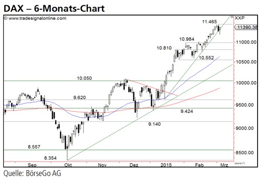 Ausblick: Die Käufer zeigen sich beim DAX weiter in Hochform. Ein Ausbruch über das jüngste Allzeithoch könnte für einen weiteren kurzfristigen Anstieg sorgen. Die Long-Szenarien: Kann der Index über die 11.465 Punkte- Marke ansteigen, würde der Zielbereich bei 11.500 Punkten angesteuert. An dieser Stelle könnte eine weitere Korrektur bis 11.200 Punkte erfolgen. Sollte der DAX dagegen auch über die 11.500 Punkte-Marke ausbrechen, wäre eine Rallyausweitung bis 11.600 und 11.650 Punkte wahrscheinlich. Kann der Wert bis zu diesem Kursniveau ansteigen, wäre dort allerdings mit einer mittelfristigen Korrektur zu rechnen. Die Short-Szenarien: Bei Abgaben unter die kleine Unterstützung bei 11.200 Punkten würde der DAX dagegen kurzfristig unter Druck geraten und zunächst an die Haltemarke bei 10.984 Punkten zurückfallen. Das Verlaufshoch des Januar bietet eine solide Unterstützung. Von dort aus sollte der Index seine Kaufwelle in Richtung 11.465 Punkte fortführen können. Ein Ausverkauf unter diesen Preisbereich hätte dagegen ein kurzfristiges Verkaufssignal zur Folge. In diesem Fall müssten weitere Verluste bis 10.810 Punkte einkalkuliert werden.