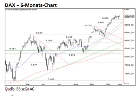 Ausblick: Nach dem starken Anstieg im Oktober ist die aktuell laufende Seitwärtsphase nicht ungewöhnlich. Der Markt muss sich zunächst einmal sammeln und neu ausrichten, ehe der nächste Aufwärtsimpuls auf der Agenda stehen dürfte. Die Long-Szenarien: Bei einem nachhaltigen Ausbruch über 9.070 Punkte würde der DAX Index erneut charttechnisches Neuland betreten und könnte in der Folge dieses Kaufsignals an die rechnerischen Kursziele bei 9.200 und 9.270 Punkten ansteigen. Auf dem Niveau von 9.270 Punkten könnte es zu einer mittelfristigen Korrektur kommen. Sollte diese Marke jedoch ebenfalls überwunden werden, sind weitere Zugewinne bis 9.400 Punkte denkbar.