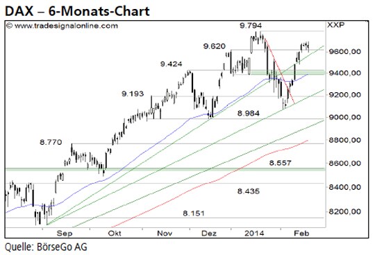 Ausblick: Mit dem Ausbruch über die letzte verbliebene Barriere vor dem Allzeithoch ist die Korrektur seit Mitte Januar aus unserer Sicht beendet. Ein weiterer Anstieg dürfte in Kürze folgen. Die Long-Szenarien: Verbleibt der DAX jetzt über 9.620 Punkten, sollte es ausgehend von dieser Marke zu einem Angriff auf das Allzeithoch bei 9.794 Punkten kommen. Dort könnten zwar Gewinnmitnahmen einsetzen und den DAX kurz zu einer Korrektur zwingen. Aufgrund der aktuellen Aufwärtsdynamik könnte es allerdings zu einem anschliessenden Ausbruch über die Barriere kommen. Diesem mittelfristigen Kaufsignal dürfte eine weitere Aufwärtsbewegung bis 9.850 Punkte folgen. Die Short-Szenarien: Für den Fall, dass der Index kurzzeitig unter die 9.620 Punkte-Marke zurücksetzt, wäre eine leichte Korrektur bis 9.537 Punkte zu erwarten. An dieser Stelle könnte sich die Rally bereits fortsetzen. Sollte die Gegenbewegung dort nicht gestoppt werden, würde sich die Korrektur bis 9.424 Punkte ausweiten. An dieser Unterstützung dürfte sich der Index jedoch wieder stabilisieren und zu einer weiteren Attacke auf das Allzeithoch ansetzen.