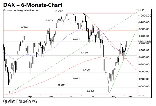 Rückblick: Nach einem starken Einbruch im Juli vollzog der DAX Index Anfang August an der Unterstützung bei 8.913 Punkten eine Trendwende und befindet sich seither in einer dynamischen Erholung.