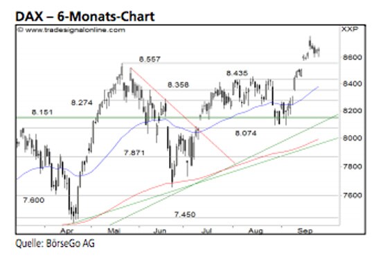 Rückblick: Ende August verteidigten die Bullen beim DAX-Index die wichtige Unterstützung bei 8.151 Punkten und bildeten dort einen kurzfristigen Doppelboden aus.