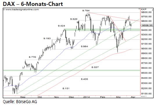 Ausblick: Bislang konnten die Bullen die Verkaufswelle bei 9.424 Punkten stoppen und den Index wieder nach Norden antreiben. Die Korrekturphase ist damit aus unserer Sicht jedoch noch nicht beendet. Die Long-Szenarien: Kurzfristig ist davon auszugehen, dass der Index im Bereich von 9.550 Punkten nochmals nach unten abdreht und an die 9.424 Punkte-Marke zurücksetzt. Dort würde sich damit ein Doppelboden bilden, von dem aus der DAX über 9.550 Punkte bis 9.620 Punkte ansteigen könnte. Ein Bruch der Hürde hätte eine direkte Kaufwelle bis an das Allzeithoch bei 9.794 Punkten zur Folge. Sollte auch das Rekordhoch überschritten werden, könnte der Aufwärtstrend zunächst bis 9.850 Punkte führen. Die Short-Szenarien: Ein nachhaltiger Bruch der markanten Unterstützung bei 9.424 Punkten würde die Kaufwelle seit Mitte März dagegen in Frage stellen und zunächst zu einem Ausverkauf bis 9.193 Punkte führen. An dieser Haltemarke hätten die Bullen ein weiteres Mal die Chance nach einer erfolgreichen Bodenbildung, den mittelfristigen Kaufimpuls fortzusetzen. Wird die Marke jedoch gebrochen, sind Verluste bis 8.984 Punkte zu erwarten.
