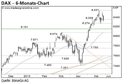 Rückblick: Der Dax Index brach Ende April aus einer bullishen Flaggenformation aus und setzte damit seine Rally dynamisch fort. Bereits Ende April wurde das frühere Allzeithoch bei 8.151 Punkten überwunden und damit ein langfristiges Kaufsignal ausgebildet.