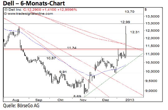 Der übergeordnete Abwärtstrend des Wertes ist zwar weiterhin intakt, dennoch ist den Bullen mit einem Ausbruch über 11,34 USD ein signifikanter Befreiungsschlag gelungen. Die Long-Szenarien: Kann sich der Wert oberhalb von 12,00 USD behaupten, dürfte es bei einem Ausbruch über 12,31 USD zu einem weiteren Anstieg bis 12,99 USD kommen. Ein erfolgreicher Ausbruch über die Marke würde einen Aufwärtsimpuls bis 13,70 USD nach sich ziehen. An dieser Stelle wäre mit einer deutlichen Korrektur zu rechnen. Würde die Barriere ebenfalls überwunden, könnte sich der Aufwärtstrend der Aktien von Dell bereits bis 14,70 USD ausweiten. Die Short-Szenarien: Unterhalb von 12,00 USD dürfte eine leichte Korrektur bis 11,34 USD führen. Ein nachhaltiger Rückfall unter diese Kreuzunterstützung würde die Ambitionen der Käufer zunächst einbremsen und einen Rückgang bis 10,87 USD einleiten. Von diesem Niveau aus könnte es jedoch zu einem weiteren Anstieg kommen. Sollte die Unterstützung allerdings durchbrochen werden, wäre ein Verkaufssignal gebildet. In der Folge dürfte der Wert bis 9,91 USD und darunter letztlich bis zum Verlaufstief bei 8,69 USD abfallen.