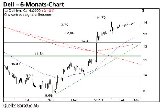Rückblick: Im Rahmen eines mittelfristigen Aufwärtstrends scheiterten die Aktien von Dell mehrfach, zuletzt im Februar 2012, an der Widerstandsmarke...