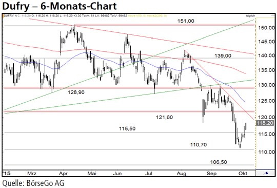 Ausblick: Die Aktien von Dufry befinden sich nach den Verkaufswellen der letzten Monate in einem Abwärtstrend. Auch die laufende Erholung dürfte daran nach unserer Auffassung wenig ändern. Die Short-Szenarien: So lange der Wert über der kurzfristigen Unterstützung bei 115,50 CHF notiert, könnte es zu einer leichten Erholung bis an die Barriere bei 121,60 CHF kommen. Dieser Kreuzwiderstand dürfte von den Bären allerdings verteidigt und eine weitere Verkaufswelle ausgelöst werden. Brechen die Aktien in der Folge wieder unter die 115,50 CHF-Marke ein, würde die Unterstützung bei 110,70 CHF zum zweiten Mal attackiert. Dort hätten die Bullen die Chance eine kurzfristige Bodenbildung zu starten. Ein Ausverkauf unter die Haltemarke hätte jedoch ein weiteres Verkaufssignal zur Folge. In diesem Fall würde ein Einbruch bis 106,50 CHF folgen. Auf mittlere Sicht könnte es sogar zu Abgaben bis 100,00 CHF kommen. Die Long-Szenarien: Aktuell wäre erst ein nachhaltiger Anstieg über den Widerstand bei 121,60 CHF bullish zu werten. In der Folge könnte sich die Erholung bis an die Kurshürde bei 128,90 CHF ausdehnen. Allerdings könnten die Bären dort wieder aktiv werden und den Abwärtstrend fortsetzen.