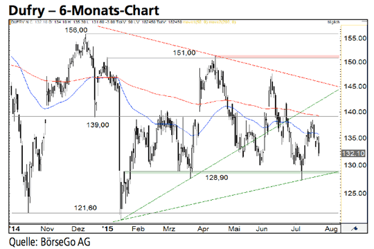 Ausblick: Die Korrektur der Aktien von Dufry verläuft aus charttechnischer Sicht seit Dezember 2014 in Form eines gewaltigen symmetrischen Dreiecks. Wird die obere Begrenzungslinie dieser Formation überschritten, würde dies zu einem langfristigen Kaufsignal führen. Die Long-Szenarien: Im Bereich der Unterstützung bei 128,90 CHF dürfte die laufende Korrekturphase jetzt enden und sich der Aufwärtstrend seit Anfang Juli fortsetzen. Sollte es den Käufern gelingen, die Bar - riere bei 139,00 CHF zu durchbrechen, wäre zugleich auch die Abwärtsbewegung seit Mitte Juni neutralisiert und damit ein Angriff auf die obere Begrenzungslinie der grossen Dreiecksformation zu erwarten. Im Bereich von 145,00 CHF könnte es anschliessend zunächst zu einer Korrektur kommen. Wird die Trendlinie in der Folge überschritten, wäre ein mittelfristiges Kaufsignal aktiviert. In den darauffolgenden Tagen könnten die Aktien weiter bis 151,00 CHF haussieren. Auf Sicht einiger Wochen wäre zudem eine Kaufwelle bis 159,50 CHF denkbar. Die Short-Szenarien: In der aktuell wieder deutlich bullishen Situation wäre erst ein Ausverkauf unter die markante Unterstützung bei 128,90 CHF ein klares Zeichen für ein vorläufiges Ende der Aufwärtsbewegung. In diesem Fall würde ein starker Abwärtsimpuls bis an das Tief aus dem Januar führen. An dieser Stelle könnten die Aktien eine mittelfristige Bodenbildung einleiten. Sollte die Marke dagegen unterschritten werden, müsste man sich auf einen Einbruch bis 110,70 CHF einstellen.