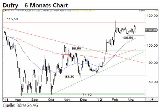 Ausblick: Die Kauflust der Bullen scheint bei den Aktien von Dufry ungebrochen und ein Ausbruch über den Widerstand bei 115,50 CHF möglich. Die Long-Szenarien: Nach einem weiteren temporären Rücklauf an die 106,50 CHF-Marke könnte es zu einem weiteren Ausbruchsversuch über 115,50 CHF kommen. Wird diese Marke durchbrochen, wäre zugleich ein Kaufsignal aktiv, welches man entsprechend „long“ handeln könnte. Im Anschluss dürfte sich der Aufwärtstrend bis 133,00 CHF und darüber bereits bis zum Allzeithoch bei 147,00 CHF fortsetzen. Auf diesem Niveau wäre mit deutlichen Gewinnmitnahmen zu rechnen. Sollte diese Marke jedoch ebenfalls durchbrochen werden, sind nach unserer Auffassung weitere Zugewinne bis 170,00 CHF denkbar. Die Short-Szenarien: Sollte der Wert hingegen deutlich unter 106,50 CHF zurücksetzen, würde dies für eine Fortsetzung der Korrektur bis 100,00 und 96,90 CHF sprechen. Auf diesem Level könnte der Markt jedoch drehen und einen weiteren Anstieg einleiten. Erst der nachhaltige Bruch dieser Unterstützung wäre bearish zu werten und könnte Folgeverkäufe bis in den Bereich um 83,30 CHF auslösen.
