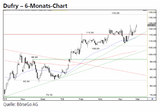 Ausblick: Die Bullen haben es in der Hand, den soliden Aufwärtstrend der Aktien von Dufry bis zum langfristigen Widerstand bei 133,00 CHF fortzuführen. Die Aufwärtsdynamik seit Anfang 2012 scheint aus unserer Sicht ungebrochen. Die Long-Szenarien: Verbleibt der Wert oberhalb der Unterstützung bei 115,50 CHF, sind Folgekäufe bis 129,00 und 133,00 CHF zu erwarten. Gelänge auch der Ausbruch über diese Barriere, sind auf mittlere Sicht bereits Kaufwellen bis 147,00 CHF und darüber bis 155,00 CHF möglich. Entsprechend könnte man einen Ausbruch über das aktuelle Wochenhoch bei 124,00 CHF „long“ handeln. Die Short-Szenarien: Erst ein Rückfall unter 115,50 CHF auf Tagesschlusskursbasis würde den Aufwärtstrend etwas abbremsen. In diesem Fall dürfte der Wert bis 106,50 CHF korrigieren. Von dieser Unterstützung aus könnte sich der Aufwärtstrend jedoch bereits wieder fortsetzen. Wird diese Marke dagegen nachhaltig unterschritten, sind weitere mittelfristige Verluste bis 96,60 CHF einzuplanen.