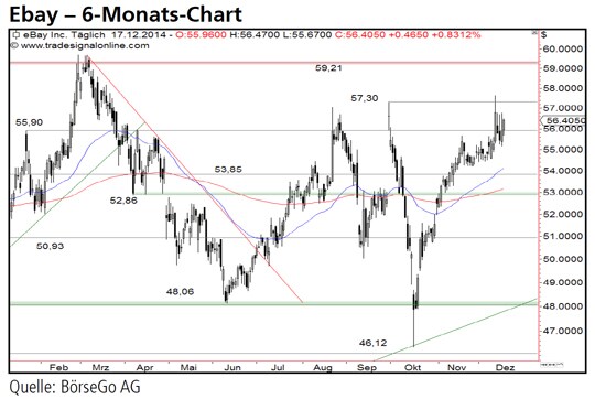 Rückblick: Nach einem steilen langfristigen Anstieg in den Jahren 2011 bis 2013, der bis auf ein Hoch bei 58,04 USD führte, gingen die Aktien von Ebay in eine volatile Seitwärtsbewegung über.