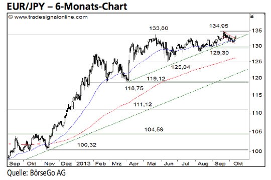 Eine kurzfristige Flaggenformation wurde nach oben aufgelöst und könnte EUR/JPY in den kommenden Tagen und Wochen neue Hochs bescheren. Sollte das übergeordnete ansteigende Dreieck trendbestätigend gen Norden aufgelöst werden, ist mit einer impulsiven Aufwärtsbewegung zu rechnen. Die Long-Szenarien: Die Bullen müssen hierfür allerdings die charttechnischen Widerstände bei 133,80 und 134,95 JPY aus dem Weg räumen. Ein Wochenschlusskurs oberhalb dieser Marken dürfte den Startschuss für eine Jahresendrally liefern. Aus dem 5-Jahres-Chart lässt sich ein übergeordnetes Kursziel von 139,80 JPY ableiten. Das rechnerische Kursziel aus dem ansteigenden Dreieck liegt mit knapp 143,00 JPY sogar noch leicht über dieser Marke. Die Short-Szenarien: Ein Rückfall unter das Wochentief bei 131,14 JPY würde eine Fortsetzung der zähen Konsolidierungsbewegung bedeuten. EUR/JPY könnte in diesem Szenario zunächst bis auf 129,30 JPY nachgeben, im Extremfall würde sogar ein Ausverkauf bis auf 125,00 JPY drohen. Die Bären sollten sich aber im Klaren sein, dass selbst ein solcher Rücklauf den langfristigen Aufwärtstrend nicht gefährden würde. Dieser verläuft aktuell bei 121,00 JPY.