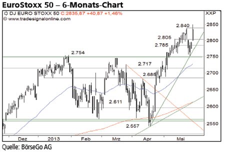 Rückblick: Ausgehend von der Unterstützung bei 2.557 Punktensetzten die Bullen im April zu einer Kaufwelle an, die mitdem Ausbruch über den Widerstand bei 2.754 Punkten denvorangegangenen Seitwärtsmarkt beim EuroStoxx 50 Indexbeendete.