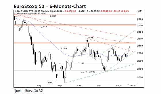 Ausblick: Der erste Schritt für einen positiven Jahresstart wurde mit dem Ausbruch aus der Dreiecksformation gelegt. Zudem aktivierte der Index damit ein mittelfristiges Kaufsignal, welches durchaus noch einiges an Potenzial freisetzen könnte. Die Long-Szenarien: Kurzfristig besteht die Möglichkeit einer weiteren Kaufwelle bis zum Niveau von 2.448 Punkten, welche man „long“ handeln könnte. Im Anschluss an diesen ersten Bewegungsimpuls wären im Bereich um 2.448 Punkte temporäre Rücksetzer bis rund 2.350 Punkte zu erwarten. Im weiteren Verlauf könnte dann die Index-Marke von 2.500 Punkten ins Visier der Anleger rücken. Die Short-Szenarien: Stellt sich der Ausbruch mit einem Rückgang unter 2.300 Punkte jedoch als Fehlsignal heraus, müssten unmittelbare Abgaben bis zur Unterstützung von 2.185 Punkten berücksichtigt werden. Sollte es dem Index nicht gelingen, diese markante Marke zu verteidigen, wären unterhalb davon die bearishen Marktkräfte im Vorteil und eine Korrekturfortsetzung bis zum Niveau von 2.077 Punkten nicht auszuschliessen. Darunter würde bereits das September-Tief bei 1.948 Punkten auf die Agenda rücken.