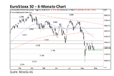 Rückblick: Direkt im Anschluss an den enormen Kurseinbruch Mitte August ging der EuroStoxx 50 Index ausgehend von einem Tief bei 2.973 Punkten in eine Erholung über, die den Index an den Bereich des markanten Widerstands bei 3.325 Punkten führte.