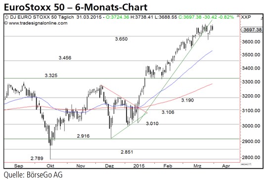 Rückblick: Nach einer kurzen Seitwärtsphase setzten die Bullen beim EuroStoxx 50 Anfang Februar den übergeordneten Aufwärtstrend mit einer weiteren steilen Kaufwelle fort und überwanden den langfristigen Widerstand bei 3.650 Punkten.