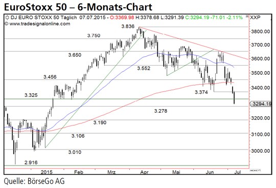 Rückblick: Im Rahmen seiner Mitte April begonnenen Korrekturbewegung fiel der EuroStoxx 50 Index im Juni bis auf 3.374 Punkte und damit in unmittelbare Nähe der wichtigen Unterstützung bei 3.325 Punkten zurück.
