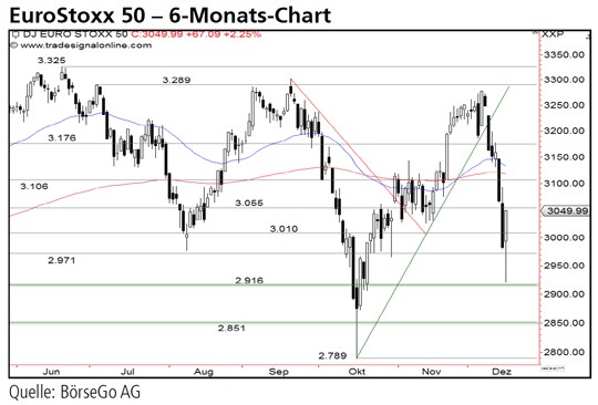 Rückblick: Nachdem der EuroStoxx 50 Anfang Dezember an der Barriere bei 3.289 Punkten gescheitert war, setzte eine dynamische Verkaufswelle ein, die bislang weite Teile der Aufwärtsbewegung der Vorwochen korrigierte.