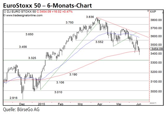 Rückblick: Im Anschluss an die Ausbildung eines neuen Verlaufshochs bei 3.836 Punkten ging der EuroStoxx 50 Index Mitte April in eine Korrektur über, die zunächst kurz vor der Unterstützung bei 3.456 Punkten stoppte.