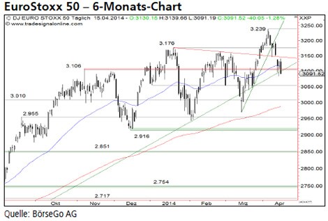 Rückblick: Anfang April brach der EuroStoxx 50 im Rahmeneines steilen kurzfristigen Aufwärtsimpulses über das bisherigeRallyhoch bei 3.176 Punkten aus.