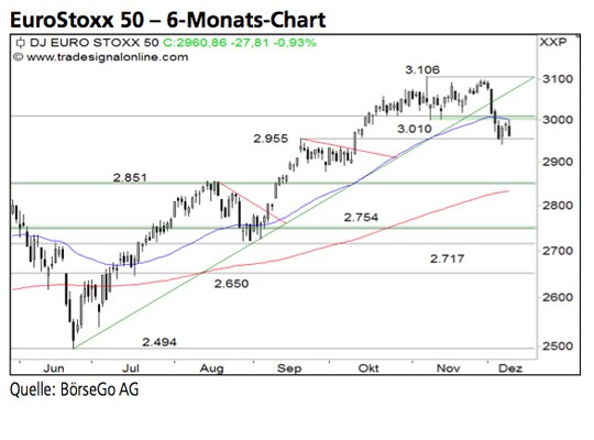 Rückblick: Nachdem der EuroStoxx 50 Index Ende November im zweiten Anlauf an der Hürde bei 3.106 Punkten gescheitert war, kam der Index vor allem in der vergangenen Woche erheblich unter Druck.