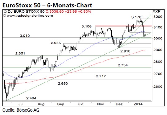 Direkt auf Höhe der mittelfristigen Aufwärtstrendlinie steht der EuroStoxx aus unserer Sicht vor einer Richtungsentscheidung für die kommenden Wochen. Dabei liegen nach dem massiven Ausverkauf die Vorteile bei den Bären. Die Short-Szenarien: Nach einer kurzen Erholung bis 3.055 Punkte könnten die Bären bereits wieder das Heft in die Hand nehmen und den Index erneut bis 3.010 Punkte ausverkaufen. Sollte die Unterstützung gebrochen werden, wäre ein weiteres Verkaufssignal aktiv, das zu Abgaben bis 2.955 Punkte führen dürfte. Darunter drohen weitere Verluste bis zur Haltemarke bei 2.916 Punkten. Dort dürfte sich der Wert jedoch wieder stabilisieren. Die Long-Szenarien: Ein Anstieg über 3.055 Punkte könnte dagegen zu einer kurzen Ausweitung der Erholung führen. Allerdings befindet sich bei 3.106 Punkten bereits ein weiterer Widerstand, an dem diese Gegenbewegung scheitern und der EuroStoxx an das aktuelle Tief zurückfallen könnte. Erst ein nachhaltiger Ausbruch über 3.106 Punkte wäre ein Zeichen dafür, dass die Abwärtsbewegung beendet wäre. Ein Anstieg bis 3.176 Punkte dürfte in diesem Fall folgen.