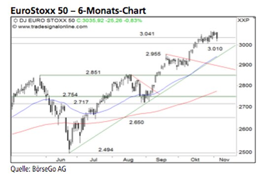 Rückblick: Seit Juni steigt der EuroStoxx 50 Index, lediglich durch zwei kurzzeitige Korrekturphasen unterbrochen, in einer steilen Aufwärtsbewegung in Richtung der 3.100 Punkte-Marke an.