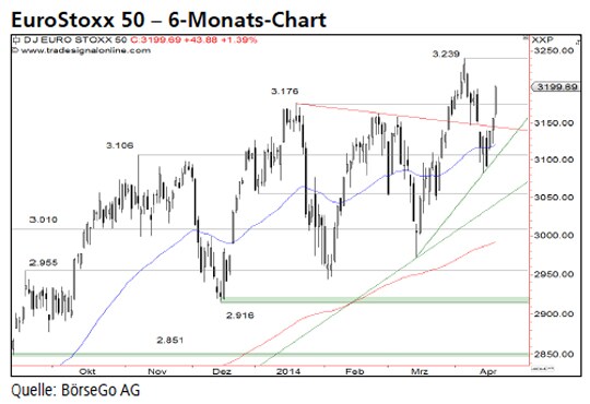 Rückblick: Mitte März setzte sich beim EuroStoxx 50 Index eine Kaufwelle in Gang, die den Wert über die Widerstände bei 3.106 und 3.176 Punkten ausbrechen liess.