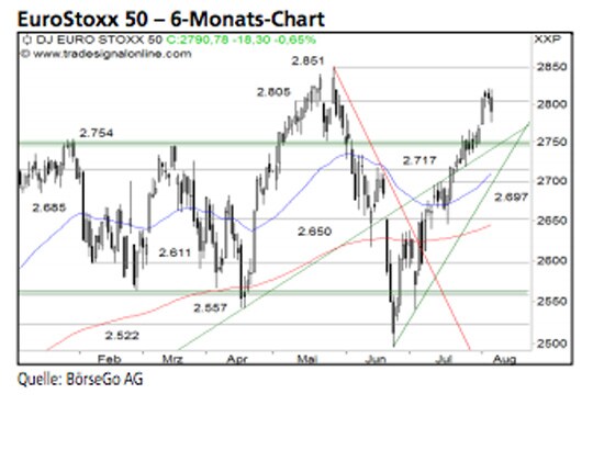 Rückblick: In der erfolgreichen Bodenbildung im Juni fand der EuroStoxx50-Index zu alter Stärke zurück und stieg in einem dynamischen Aufwärtsimpuls in Richtung des Widerstands bei 2.754 Punkten an.