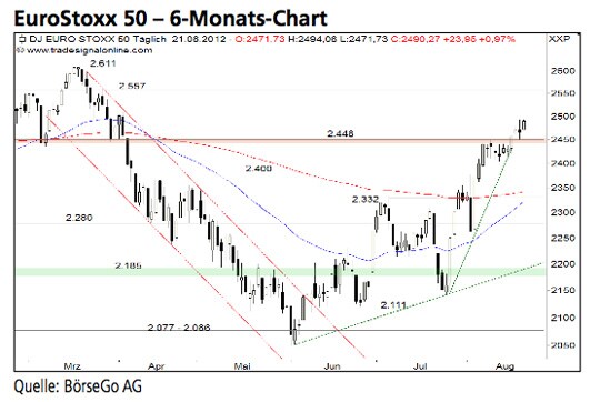 Rückblick: Der EuroStoxx 50 Index stieg seit Ende Juli in einer steilen Kaufwelle über die wichtigen Widerstandsmarken bei 2.332 und 2.400 Punkten an...