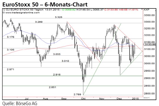 Rückblick: Der EuroStoxx 50 Index befindet sich seit Monaten in einer schwankungsreichen Seitwärtsbewegung und fiel dabei in einer steilen Korrektur bis an die 2.916 Punkte-Marke zurück.