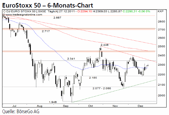 Ausblick: Gelingt dem EuroStoxx 50 der nachhaltige Bruch der 2.310 Punkte-Marke, wäre eine Fortsetzung der Aufwärtstendenz der letzten Tage zu erwarten. Für eine weitere Aufwärtsbewegung muss jedoch der Ausbruch aus dem Dreieck abgewartet werden. Die Long-Szenarien: Kann der Index auf Tagesschlusskursbasis über den Kreuzwiderstand bei 2.341 Punkten ansteigen, wäre die dreiecksförmige Konsolidierung beendet und ein mittelfristiges Kaufsignal aktiv. Dies könnte man mit einem Longengagement handeln. Im Anschluss sollte es nach unserer Einschätzung zu einem Anstieg bis 2.448 Punkte kommen, der sich möglicherweise direkt bis 2.506 Punkte fortsetzt. Auf diesem Niveau wären erste Gewinnmitnahmen angebracht. Die Short-Szenarien: Sollte der EuroStoxx hingegen am Widerstand bei 2.341 Punkten scheitern und im Anschluss unter die Haltemarke bei 2.230 Punkten zurücksetzen, wäre ein Rückfall auf die markante Unterstützung bei 2.185 Punkten die Folge. Dort sollte jedoch mit einem weiteren Anstieg gerechnet werden. Erst der nachhaltige Bruch dieser Unterstützung wäre kurzfristig bearish zu werten und könnte Abgaben bis 2.077 Punkte auslösen.