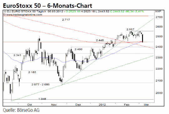 Rückblick: Der EuroStoxx 50 Index scheiterte bereits am vergangenen Freitag daran, das Hoch vom 21. Februar bei 2.557 Punkten zu überwinden.