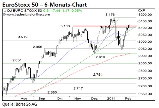 Rückblick: Seit dem Tief im Dezember 2013 bei 2.916 Punkten befindet sich der EuroStoxx 50 in einer sich schrittweise verengenden Seitwärtsbewegung.