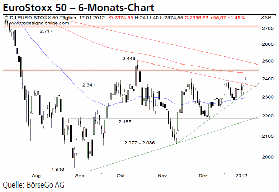 Ausblick: Nach wie vor müssen die Bullen den EuroStoxx 50 erst über den Widerstand bei 2.400 Punkten kaufen, um ein weiteres Longsignal zu bilden. Die Chancen stehen seit dem gestrigen Anstieg jedoch besser denn je. Die Long-Szenarien: Im EuroStoxx 50 würde bei einem nachhaltigen Ausbruch über 2.400 Punkte ein kurzfristiges Kaufsignal generiert, welches man entsprechend „long“ handeln könnte. In der Folge dürfte der Index zügig bis 2.448 Punkte und darüber bis zum Widerstand bei 2.506 Punkten ansteigen. Sollte im Anschluss auch die Hürde bei 2.535 Punkten durchbrochen werden, ist ein weiterer Kurssprung bis 2.600 Punkte möglich. Die Short- Szenarien: Eine leichte Korrektur bis zur kurzfristig wichtigen Unterstützung bei 2.300 Punkten würde dagegen bei einem Rückfall unter die umkämpfte Marke bei 2.341 Punkten ausgelöst. Von dort aus könnte sich der Aufwärtstrend unserer Auffassung nach jedoch uneingeschränkt fortsetzen. Eine Abwärtsbewegung, die unter diese Marke führt, würde für eine vorübergehende Marktschwäche sprechen. In diesem Fall wären Abgaben bis 2.230 und 2.185 Punkte die Folge.