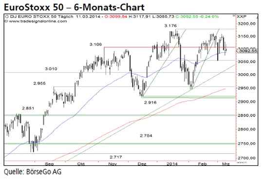 Ausblick: Der EuroStoxx 50 konsolidiert weiterhin den Anstieg vom Februar und könnte aus unserer Sicht bei 3.055 Punkten einen bullishen Doppelboden ausbilden. Dennoch weisen die zwischenzeitlichen Abwärtsbewegungen auf zunehmenden Verkaufsdruck hin. Die Long-Szenarien: Kurzfristig dürfte der Index jetzt also bis 3.055 Punkte zurücksetzen, dort einen Boden ausbilden und anschliessend wieder bis an die Widerstandszone von 3.158 bis 3.162 Punkten steigen. Dort wäre mit einer starken Auseinandersetzung der Bullen und Bären zu rechnen. Ein erneuter Ausverkauf kann dabei nicht ausgeschlossen werden. Bricht der EuroStoxx im Anschluss jedoch über 3.162 Punkte aus, dürfte auch das Hoch bei 3.176 Punkten überwunden werden. Dieses Kaufsignal könnte einen direkten Anstieg bis 3.225 Punkte nach sich ziehen. Die Short- Szenarien: Gelingt es der Käuferseite dagegen nicht, bei 3.055 Punkten eine Stabilisierung einzuleiten, würde bei einem Bruch der Marke ein kurzfristiges Verkaufssignal aktiv. In der Folge dürfte die mittelfristige Aufwärtstrendlinie unterschritten werden und der Index bis an die 2.955 Punkte-Marke fallen.