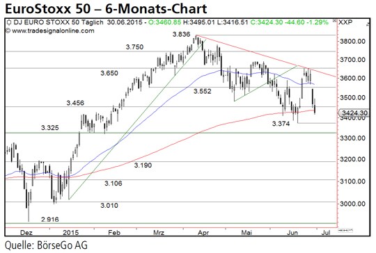 Rückblick: Der EuroStoxx 50 Index fiel von Anfang April bis Mitte Juni in einer Korrekturbewegung bis unter die Unterstützung bei 3.456 Punkten zurück, konnte sich jedoch im Bereich von 3.380 Punkten stabilisieren.