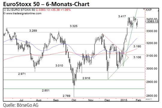 Rückblick: Der EuroStoxx 50 Index setzte seinen Mitte Oktober begonnenen Aufwärtstrend im Januar ausgehend von der 3.010 Punkte-Marke fort und stieg in einer dynamischen Kaufwelle an das bisherige Verlaufshoch bei 3.325 Punkten an.