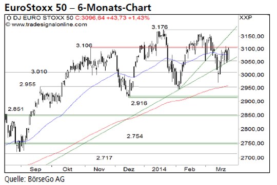 Ausblick: Mit Blick auf die ansteigende Trendlinie knapp unterhalb des angesprochenen Widerstandes bei 3.106 Punkten spitzt sich die Lage beim EuroStoxx 50 förmlich zu. In Kürze ist mit einer Entladung des angestauten Drucks zu rechnen. Die Long-Szenarien: Steigt der Index in den kommenden Tagen über die kurzfristig entscheidende Hürde bei 3.106 Punkten, wäre ein Kaufsignal aktiv. Dieses könnte den EuroStoxx 50 zügig in Richtung des Jahreshochs bei 3.176 Punkten führen. Dieses wiederum bildet einen langfristig wichtigen Widerstand. Sollte auch die Marke bei 3.176 Punkten überschritten werden, wäre viel Platz vorhanden in Richtung 3.456 Punkte. Ein Etappenziel auf diesem Weg bildet die Marke von 3.225 Punkten. Die Short-Szenarien: Ein Unterschreiten der Unterstützung bei 3.055 Punkten würde das Chartbild indes eintrüben. Die Bären könnten in diesem Fall ihre Chance wittern und den Index in Richtung der Unterstützung bei 3.010 Punkten drücken. Hält auch diese Marke nicht, könnte die wichtige Unterstützung bei 2.955 Punkten erneut ins Blickfeld rücken.