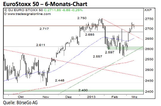 Kurzfristig befindet sich der Index in einer symmetrischen Dreiecksformation, die auf eine baldige Fortsetzung des Aufwärtstrends hindeutet. Die Long-Szenarien: Ausgehend von der 2.711 Punkte-Marke dürfte es zu einem Kaufimpuls bis an den Widerstand bei 2.750 Punkten kommen. Würde diese massive Kursbarriere auf Tagesschlusskursbasis durchbrochen, wäre dies ein Zeichen dafür, dass sich die Rally mittelfristig fortsetzen dürfte. In diesem Fall dürfte zunächst ein Aufwärtsimpuls bis 2.830 Punkte führen. Darüber hätte der Index bereits Potential bis 2.880 Punkte. Die Short-Szenarien: Käme es auf dem aktuellen Niveau zu Abgabedruck, könnte sich eine Korrektur bis 2.685 Punkte entwickeln. Von dort aus wäre mit einem weiteren Anstieg zu rechnen. Setzt der EuroStoxx 50 Index hingegen unter diese Haltemarke zurück, dürfte ein Ausverkauf bis zur Kreuzunterstützung bei 2.611 Punkten einsetzen. Kann diese Marke nicht zu einem Wieder- anstieg genutzt werden, wäre ein Verkaufssignal aktiv.