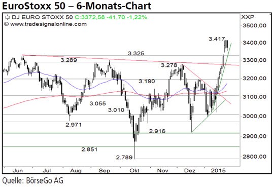 Ausblick: Sowohl das Kursziel aus dem Dreieck im Tageschart wie auch das Projektionsziel nach dem Überwinden der mehrmonatigen Abwärtstrendlinie sind noch offen. Der Langfristchart lässt zudem deutlichen Spielraum auf der Oberseite. Die Long-Szenarien: Weitere Verlaufshochs würden den Aufwärtstrend der vergangenen Tage untermauern. Dabei gilt es zunächst, das bisherige Wochenhoch bei 3.417 Punkten zu überwinden. Ein solches Signal würde Potenzial bis zum Hoch aus dem August 2008 bei 3.456 Punkten eröffnen. Wiederum darüber wäre langfristig der Weg auf 3.900 Punkte im Index mit hoher Wahrscheinlichkeit geebnet. Die Short-Szenarien: Eine Konsolidierung auf hohem Niveau würde am positiven Chartbild nichts ändern und zeichnete sich bereits gestern ab. Erst wenn der EuroStoxx 50 Index das Kaufsignal mit Kursen unter 3.278 Punkten wieder negieren würde, müsste man sich auf weitere Abgaben einstellen. In diesem Fall könnte der Index in einem ersten Schritt auf 3.190 Punkte und, -sollte dort keine Stabilisierung einsetzen,- auf 3.055 Punkte nachgeben.