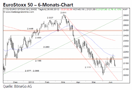 Rückblick: Der EuroStoxx 50 Index brach Mitte Juni aus dem bis dahin den Kursverlauf bestimmenden Abwärtstrendkanal aus...