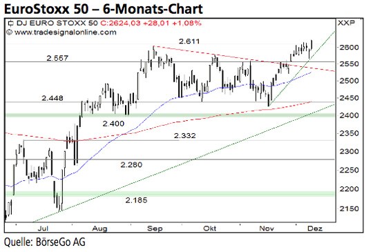 Rückblick: Seit Mitte November setzte sich der mittelfristige Aufwärtstrend des EuroStoxx 50 Index ausgehend von der Unterstützung bei 2.448 Punkten mit...