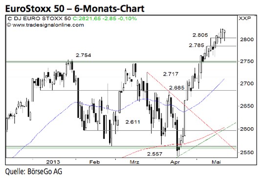 Der dynamische Aufwärtstrend des EuroStoxx 50 Index ist weiterhin intakt. Die gestrige kleine Gegenbewegung ist entsprechend als gesunde Korrektur im Rahmen der laufenden Hausse zu werten. Die Long-Szenarien: Sollten künftige Rücksetzer von den Bullen oberhalb von 2.785 Punkten gestoppt werden, wäre ein erneuter Anstieg bis 2.826 Punkte zu erwarten. Hier bestünde die Gefahr der Ausbildung eines kleinen Doppelhochs, welche jedoch mit einem nachhaltigen Ausbruch über die Marke verhindert werden könnte. Ein sol- cher Anstieg würde für eine Ausweitung der Rally bis 2.875 Punkte sorgen. Die Short-Szenarien: Dagegen käme es zu einem prinzipiell bullish zu wertenden Rücklauf an das frühere Rallyhoch bei 2.754 Punkten, sollte der Index unter 2.785 Punkte zurückfallen. Von dort könnte sich der Aufwärtstrend problemlos fortsetzen. Selbst eine stärkere Abwärtsbewegung bis 2.717 Punkte würde am bullishen Ausblick wenig ändern. Erst ein Bruch dieser Marke hätte derzeit ein kleines Verkaufssignal und Abgaben bis 2.650 Punkte zur Folge.