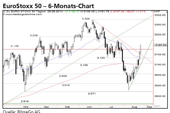 Rückblick: Nachdem der EuroStoxx 50 Index Anfang August seinen Abwärtstrend kurz vor der Unterstützung bei 2.971 Punkten erfolgreich abgebremst hatte, stieg der Wert in einer ersten Erholungsbewegung direkt über die Hürde bei 3.055 Punkten.