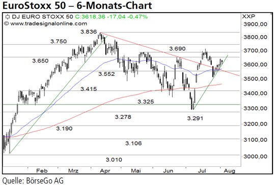 War es doch nur ein temporärer Ausrutscher im EuroStoxx 50? Gemeint ist der starke Rückgang am 27. Juli, der den Index unter 3.552 Punkte drückte.