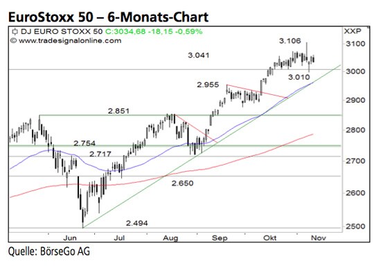 Rückblick: Mit dem Ausbruch über das bisherige Jahreshoch bei 2.851 Punkten setzte sich Anfang September eine Aufwärtswelle beim EuroStoxx 50 Index fort.