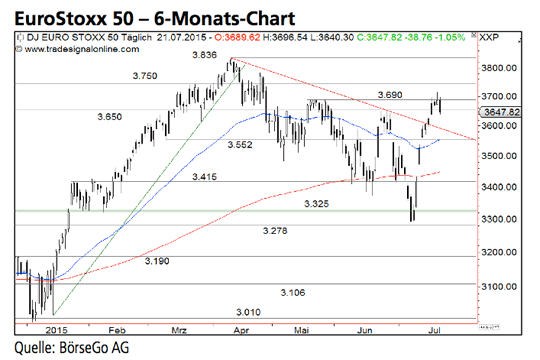 Anfang Juli beendeten die Bullen eine mehrmonatige Korrekturphase beim EuroStoxx 50 kurz vor dem Erreichen der wichtigen Unterstützung bei 3.278 Punkten mit einer steilen Kaufwelle.